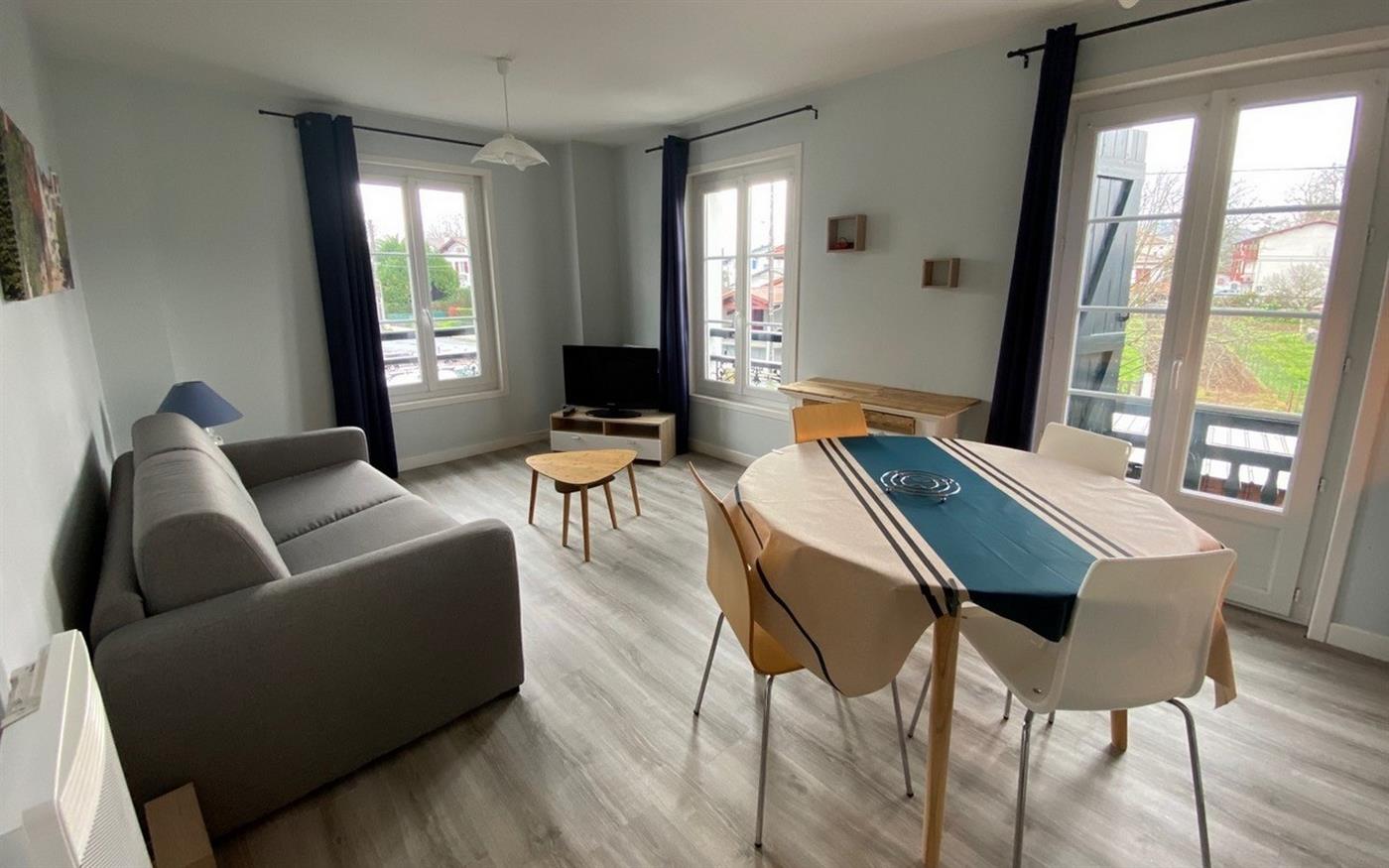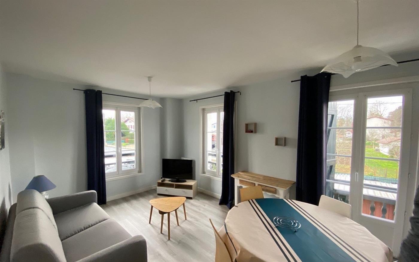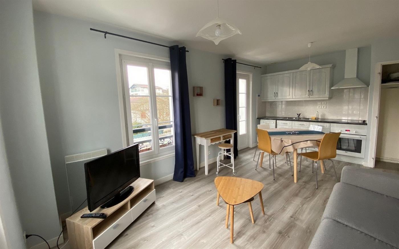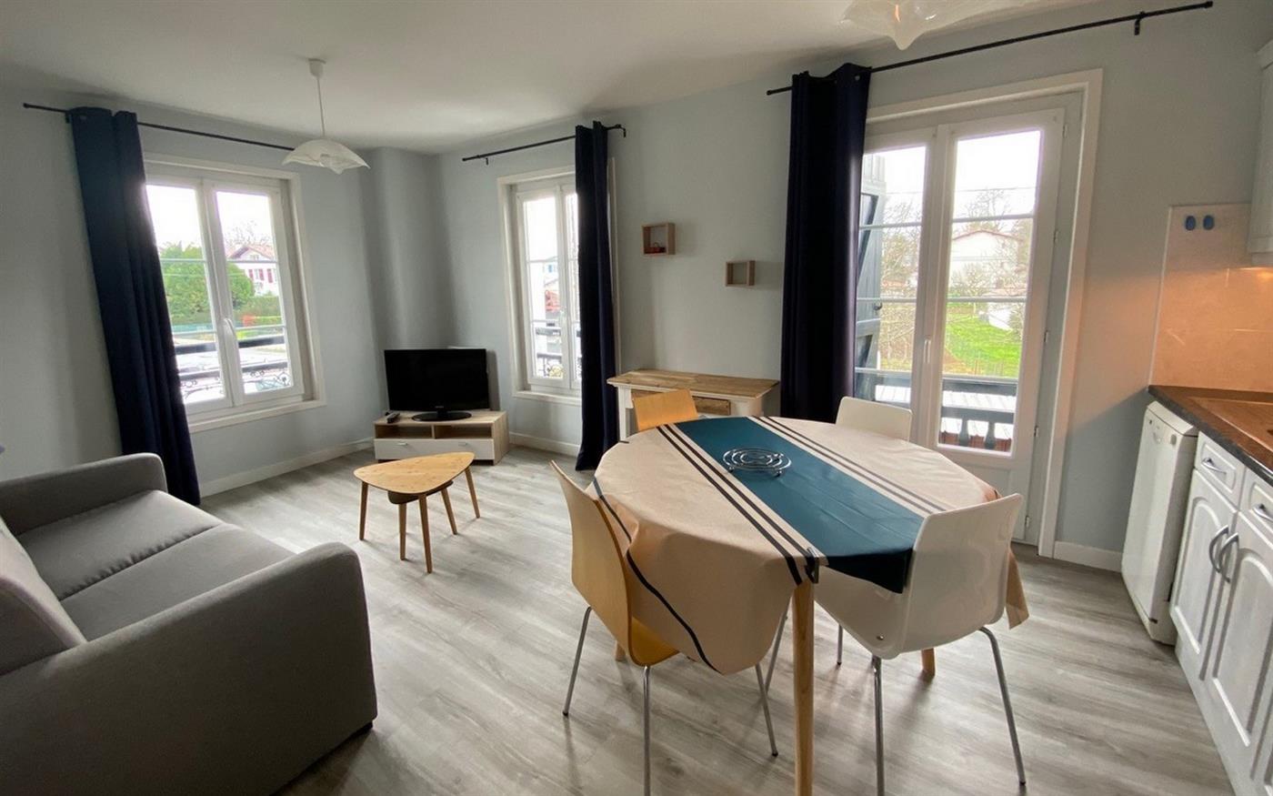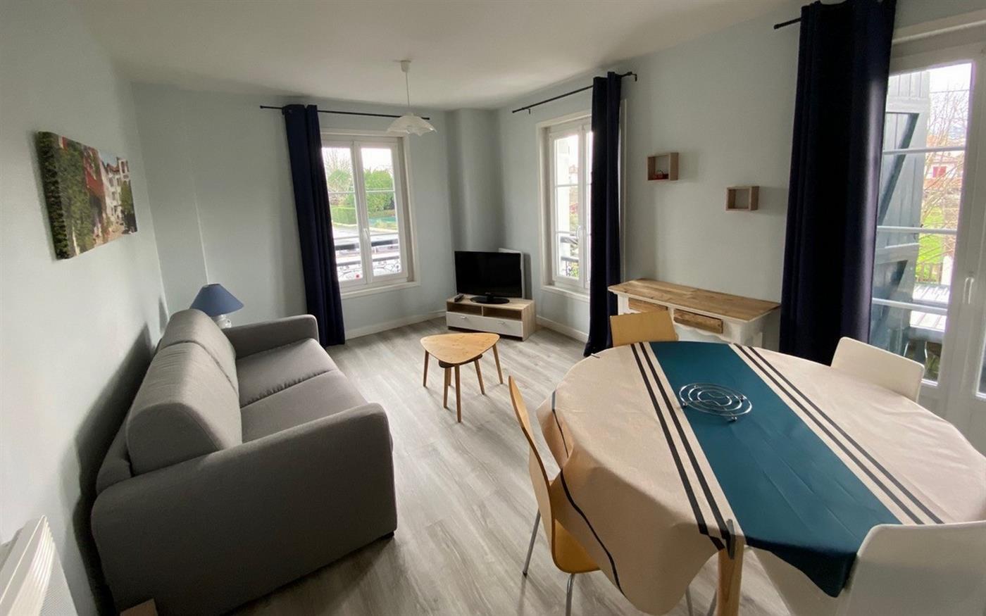 The apartment of 39 m² is located on the 1st floor of a town house. The kitchen is equipped with a microwave, electric hotplates, dishwasher, fridge/freezer and is open to the living room with flat screen TV, DVD player and a sofa bed for 2 persons. The bedroom is equipped with 1 bed in 140. The bathroom includes shower, sink, washing machine and the toilets are in the sanitary facilities.