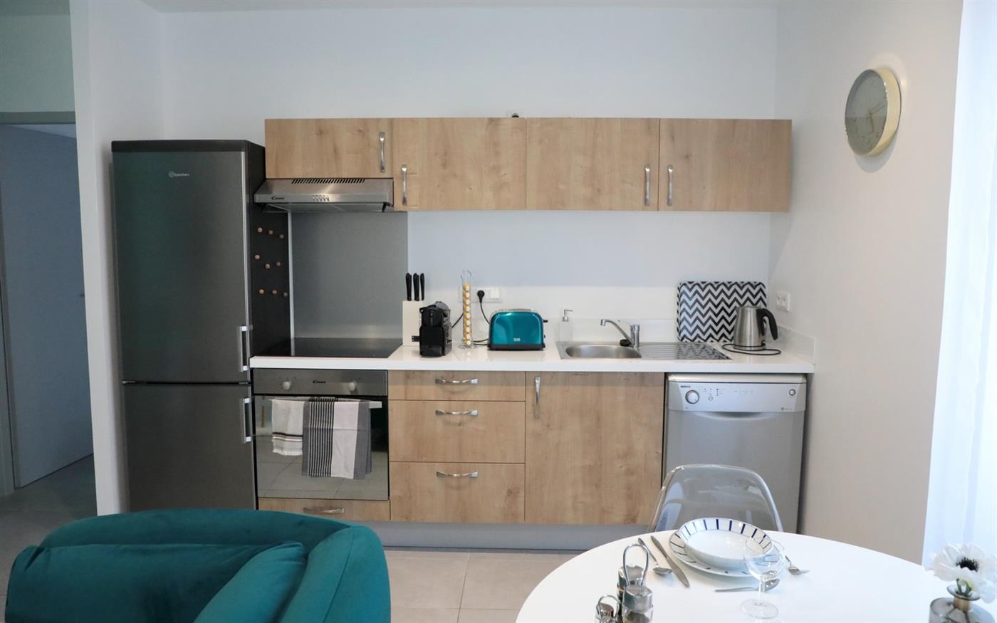 The fully equipped kitchen is open to the living room with dining area, sofa and coffee table