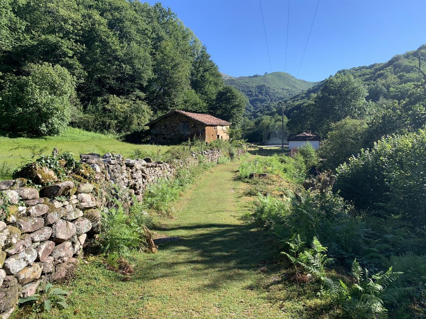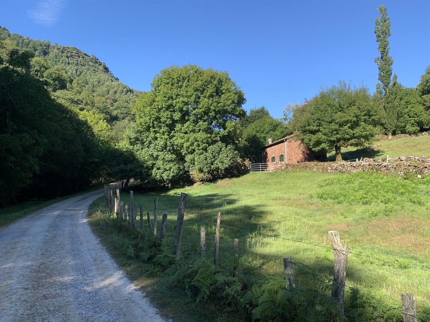 Aller Lat : 43.2573386 - Long : -1.3879739 Du parking, emprunter une piste bétonnée en descente prononcée sur 500 m avant de traverser le Bastan sur un pont. Passer à gauche d'une habitation et poursuivre sur la large piste qui s'enfonce dans un très beau sous-bois. La piste longe en surplomb le cours d'eau en offrant de belles vues sur les Peñas de Ixusi. Après 3,5 km, prendre à gauche au niveau d'une patte d'oie. Le cheminement se poursuit sur 1,8 km en longeant le ruisseau et quelques prairies avant de tourner à droite au niveau d'une intersection pour rejoindre et traverser le cours d'eau. Suivre un muret de pierres et rejoindre le village abandonnée.Step 2 :