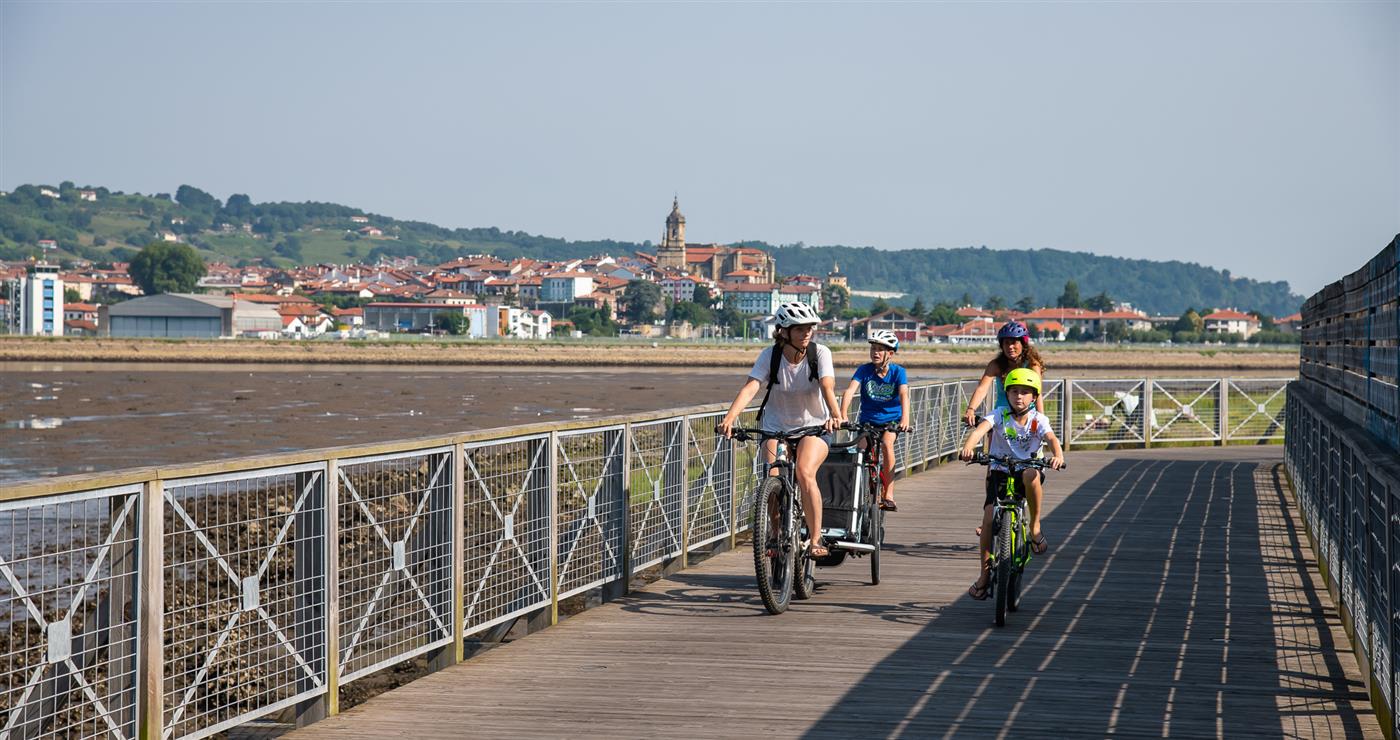 Du pont Saint-Jacques au port de Caneta Sur l’esplanade du pont Saint-Jacques, un ascenseur vous permet d’entrer avec votre vélo et de descendre d’un niveau. Prendre alors pied sur une promenade piétons et vélos, en balcon sur la rivière Bidassoa, que l’on emprunte vers la droite (en passant sous les ponts ferroviaires). Après les caillebotis, la piste cyclable continue à longer l’estuaire de la Bidassoa, avec vue sur Hondarribia. Parvenir ainsi dans l’anse de l’ancien port de Caneta.Step 2 :