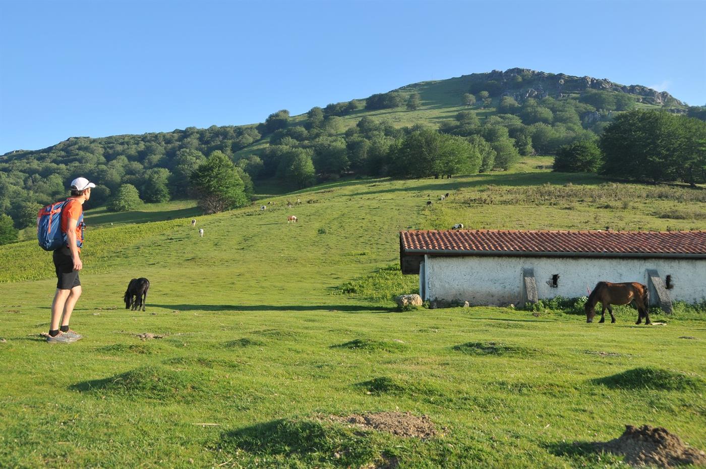 Passage par l'Erregelu et la crête de Kurutze Du Baigura (897 m), revenir par la crête vers la table d'orientation, puis prolonger vers le sommet d'Erregelu, en l'abordant par la gauche. Après la pause, quitter l'Erregelu (865 m) par la longiligne crête orientale. D'abord pentue mais facile, le sentier progresse ensuite sur la crête de Kurutze, assez plane (vue jusqu'à la Soule). Puis il bascule à droite sur le versant sud pour effectuer une longue traversée descendante. Une fois sur un replat herbeux, garder en face le bon chemin qui bifurque vite à gauche et décrit un nouveau parcours à flanc de montagne.Step 5 :