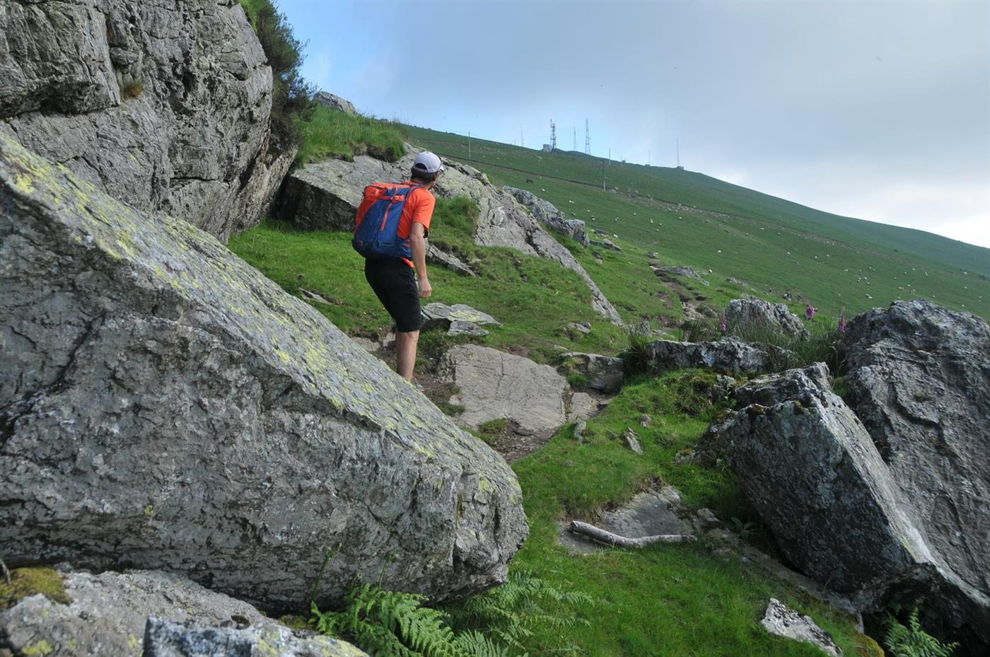 De la bergerie de Buztingorri aux rochers d'Erregelu Monter droit dans l'herbe au-dessus de la bergerie (470 m) ; ignorer l'intersection du sentier de découverte et grimper toujours tout droit vers la forêt de hêtres. Après avoir coupé un autre chemin, le sentier traverse vers la droite, toujours abrupt, vers une crête rocheuse. Il fait deux lacets sous les arbres puis slalome entre les blocs rocheux.Step 3 :