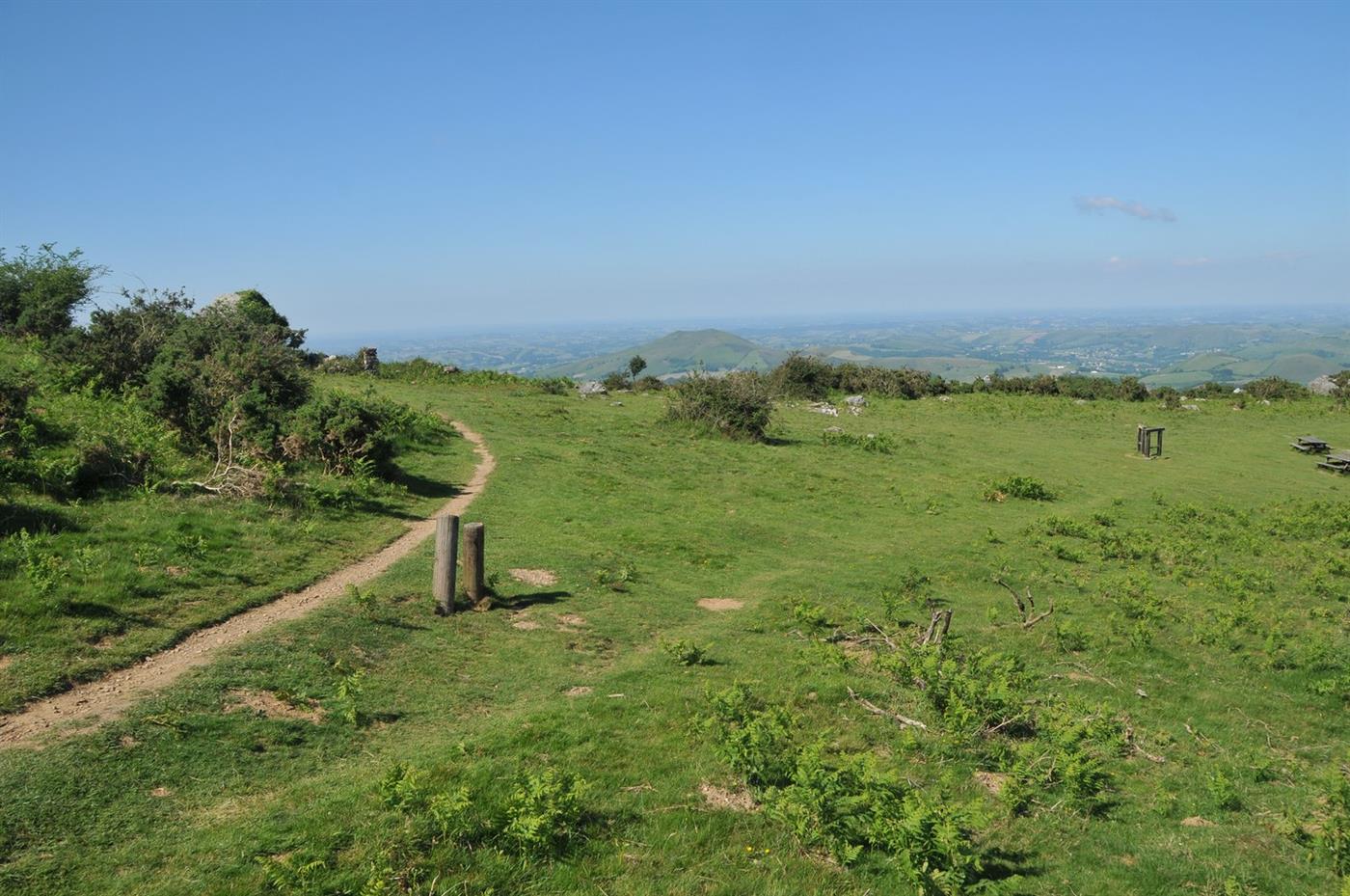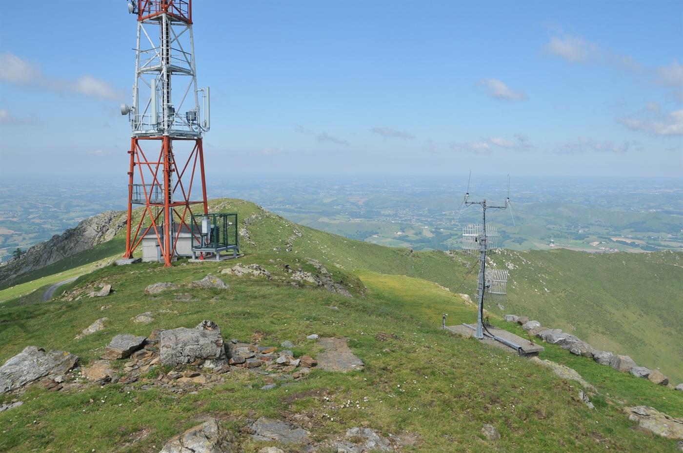 La montée finale au Baigura Au passage d'une petite brèche (740 m), vous découvrez le sommet du Baigura. Le sentier décrit maintenant une traversée ascendante rectiligne sur le flanc ouest de la montagne. Passer au-dessus d'un lacet de la route. Au dernier lacet, monter dans l'herbe à gauche et suivre la crête vers la droite, en passant par la table d'orientation et les cromlechs. 50 m après, passer à droite des émetteurs clôturés, puis suivre route et chemin jusqu'aux dernières antennes. Gravir à gauche les quelques mètres vous séparant du sommet du Baigura.Step 4 :