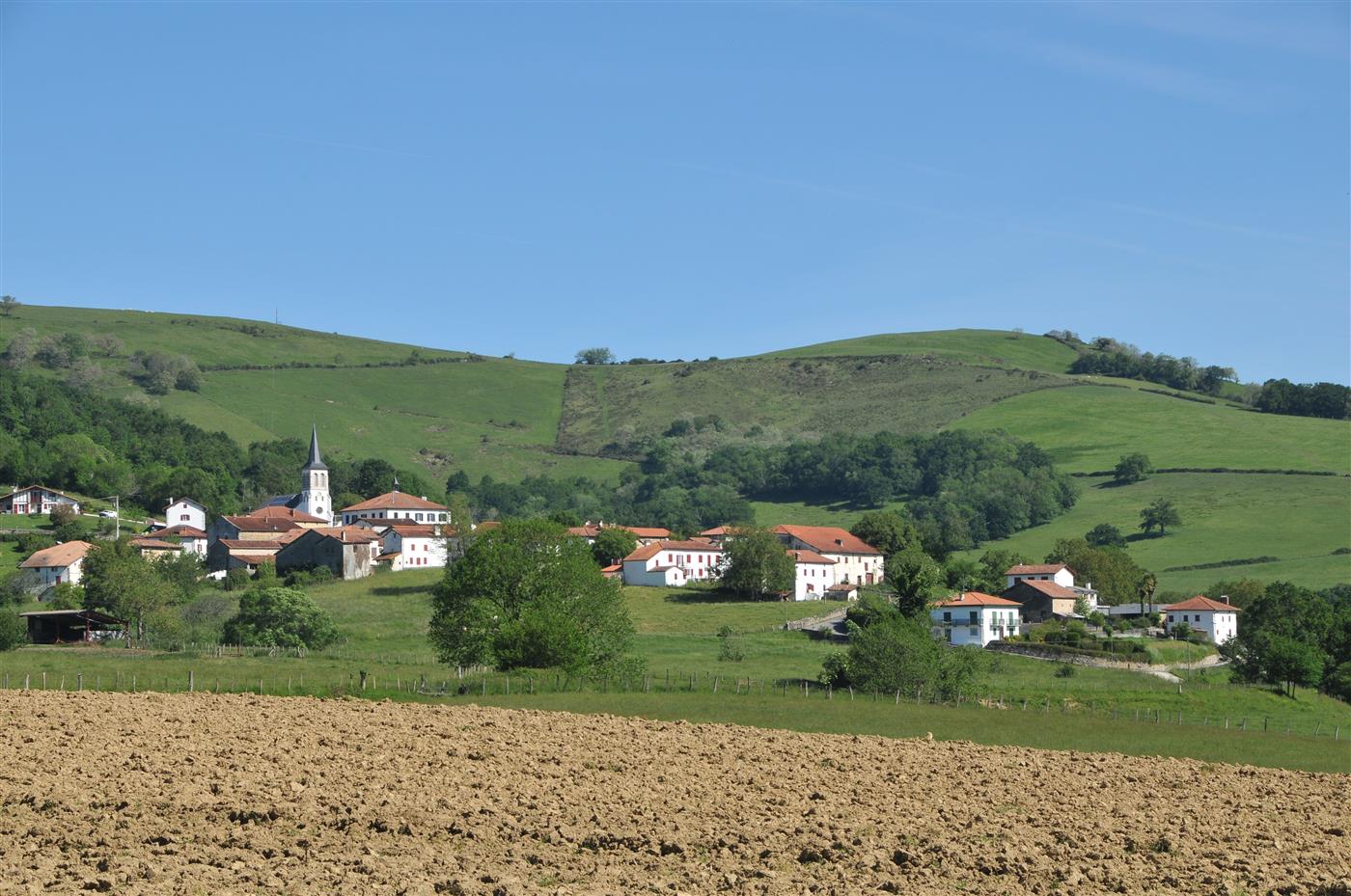 Ainhice Mongelos En arrivant dans le hameau de Cibits (15,35 km), au croisement de la D 918, faire 30 m à gauche et tourner aussitôt à droite pour passer contre le fronton et l'église de Cibits. Garder longuement la petite route qui suit, au-delà de la chambre d'hôtes Arantzeta. Après avoir ondulé entre les champs, la route retrouve la D 933 (18,3 km) :Traverser avec prudence la D 933 à hauteur de la ferme Utziate et suivez la signalétique jusqu'à Ainhice Mongelos.Step 4 :