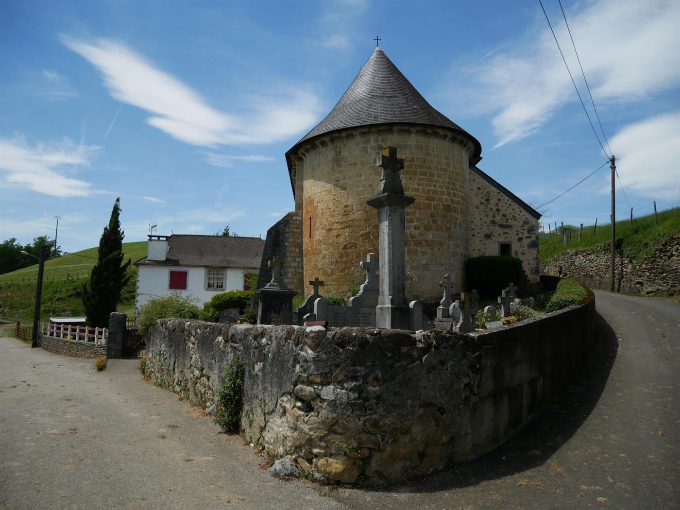 De Tardets à Camou-Cihigue Suivre la route sur 500 m en longeant rive droite la rivière avant de tourner à droite (D57)en direction d’Abense. Franchir le pont pour entrer dans Abense de Haut. La première montée se présentant sur la droite est à suivre et obligera peut-être à mettre pieds à terre sur une cinquantaine de mètres. Longer le cimetière et tourner à droite pour s’engager sur une belle route champêtre. Une deuxième bosse se présente sur environ 200m. L’effort de courte durée offre par la suite de belles ambiances en longeant des tilleuls centenaires et en apercevant quelques pottoks au milieu des champs. L’itinéraire entame une longue descente jusqu’à rejoindre la D247 à suivre en tournant à gauche. Entrée dans Sunharette et nouvelle bosse à passer sur une centaine de mètres. Ce fond de vallon est dédié à l’élevage de brebis de races manech et basco-béarnaise. A la bifurcation, suivre à droite la D149 pour entrer dans Alçabehety. Un passage dans la petite église de Sainte Agnès permettra de voir quelques stèles discoïdales caractéristiques des cimetières basques.Dans le village, prendre à gauche en direction de Camou (D149). La route s’éloigne du village en jouant les montagnes Russes ! Les quelques bosses font rapidement place à une montée sur 300 m avant de rejoindre le point culminant du circuit altitude 293 m. La vue est ici remarquable avec à l’ouest le massif des Arbailles. Descente avec prudence jusqu’à rejoindre Camou et l’auberge « Chez Aguer ».Step 2 :